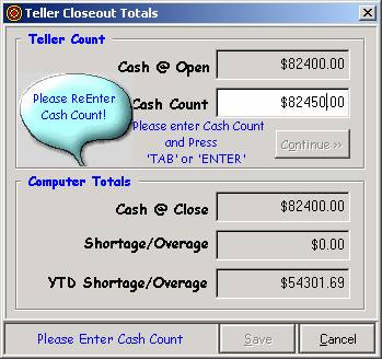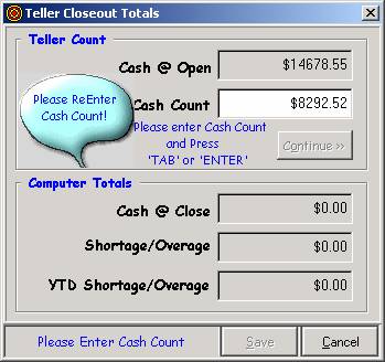 teller drawer, including inventory items such as stamps. Type in the Cash Count and press Enter.